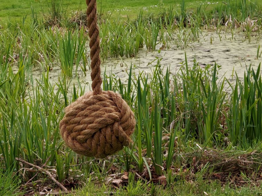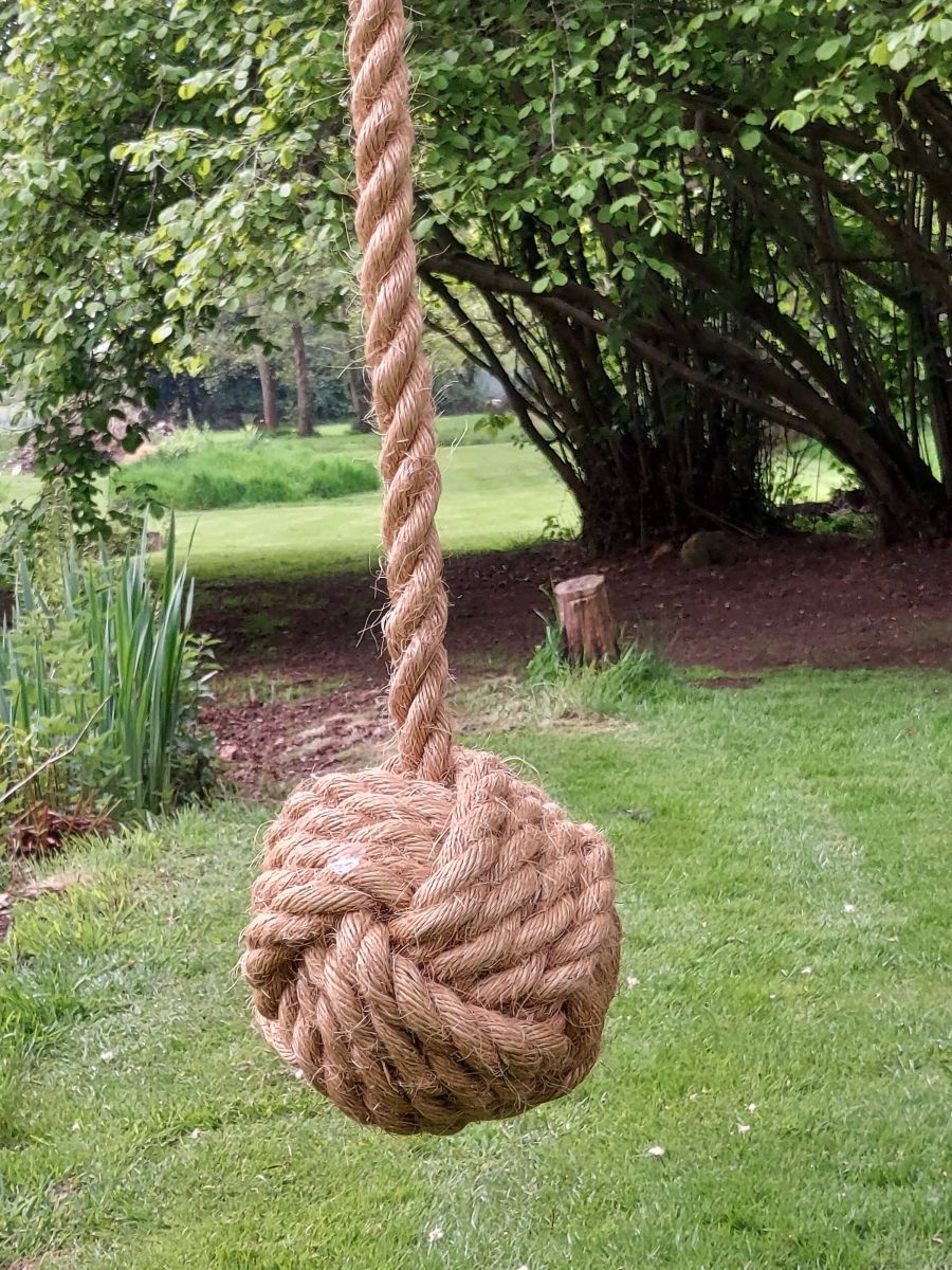 A slight variance to our normal but living within the boating environment of the Norfolk & Suffolk Broads and using a monkey fist knot whilst sailing, it seemed logical to make the Monkey Fist Swing with 5 turns of our natural rope and then with a 6m tail for hanging on the perfect branch of your tree.
