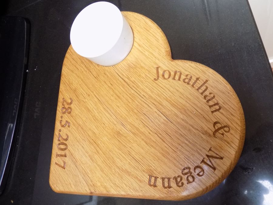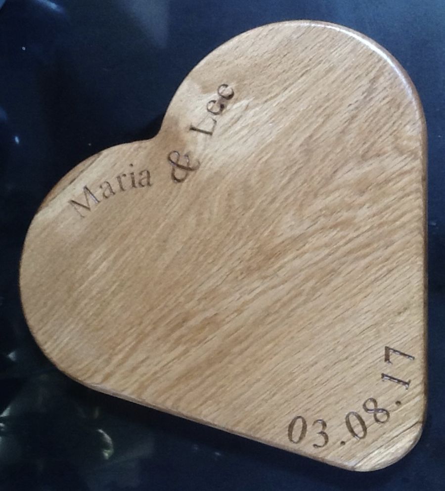 A 12 inch/ 300mm oak heart shape board with details carved in the two top curves of the heart and the date carved at the bottom of the heart shape. These are and ideal gift for any special day you wish to remember.